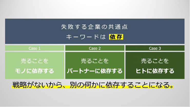 私は過去20年近くにわたり1,000社以上の海外展開の支援を行ってきました。その中で感じたのが、大手企業ですら、非常に根本的な過ちをおかしているということです。海外展開に失敗している企業は、現在、実行しているプロセスの中で、売ることを「モノ」か、「パートナー」か、「ヒト」のいずれか、またはそれらの複数に依存しているという事実があるのです。この「依存」が、海外で売上やシェアを上げるための大きな妨げになる、大変危険な存在だということを知っておかなければなりません。