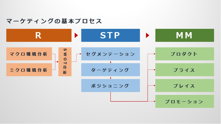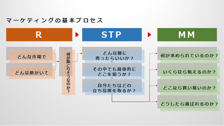 この『R−STP−MM』の3つを順番に組み立てていくことが、「マーケティングの基本プロセス」です。