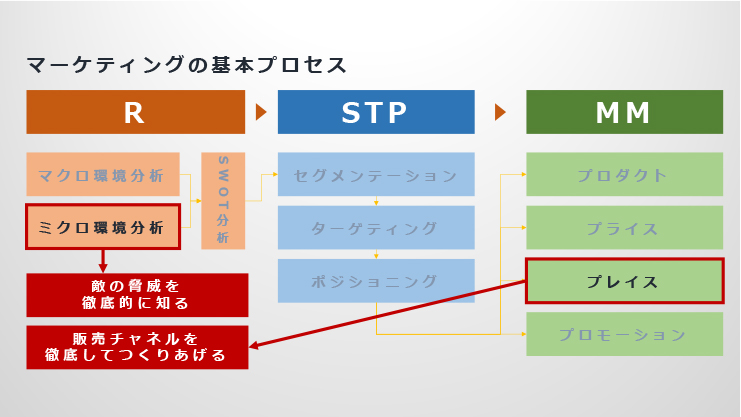 このプロセスの中でも特に重要なのが、ミクロ環境分析である、敵を徹底的に知ることと、MM のプレイスにあたる販売チャネルを作り上げることです。特に日本企業はこの2つが弱いです。