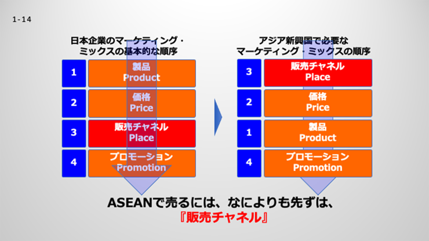 前項で、マーケティング・ミックスの4つが最適化されなければならないと述べましたが、最適化するまでには、取り組むべき順序があります。通常はプロダクト→プライス→プレイス→プロモーションの順ですが、アジア新興国では何を置いてもプレイス、つまりは販売チャネルが最優先です。その後に、プライス→プロダクト→プロモーションと続きます。このことは、日本におけるグローバル・マーケティング研究の第一人者である明治大学経営学部の大石芳裕教授も言っています。この最優先にすべき販売チャネルこそ、日本企業にとって最もネックになっているところなのです。日本のメーカーの商品が優れていることはもうわかっていて、問題なのは、その品質や機能が本当に現地の消費者に望まれているかどうかということ。結局、2番目のプライスを下げようと努力しても、プロダクトの品質にこだわりすぎるあまり高額になってしまいます。そんな状態でアジアに出 て、3番目のプレイス(販売チャネル)を広げようとしても、そんなに高 額な商品は日系スーパー、もしくは限られた人しか行かない高級スーパー の輸入品棚にしか並びません。アジアに出てまでイオンや伊勢丹、日本食材専門スーパーにしか商品が並ばないのなら、30億人の中間層が最大の魅力であるアジア新興国に出る意味はありません。であれば、日本で地方都市を集中的に狙ったほうが苦 労も少なくROI(return of investment =投資対効果)も高いのです。