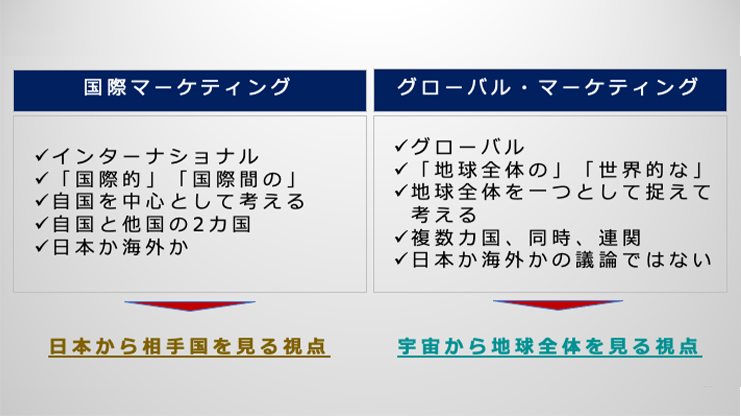 ここでもう少し、この「インターナショナル」と「グローバル」の違いを掘り下げていきましょう。「インターナショナル」とは、日本語にすると、「国際的」とか、「国際間の」と訳されます。英語の「Inter」や「National」の意味から考えても、この「インターナショナル」は、あくまで自国を中心として考えた時の他国との関わり合いを表しています。一方で、「グローバル」はどうでしょうか。「グローバル」は、「地球全体の」、「世界的な」と訳されています。つまりは、地球全体を一つとして捉えて物事を考えることです。つまり、国際マーケティングとグローバル・マーケティングでは、市場を見る時の視点が異なるということです。国際マーケティングでは自国と外国との間のマーケティングですから、市場の区別も「国内市場」と「海外市場」という見方になりますが、グローバル・マーケティングにおいては、自国の市場である国内市場は、基本的には中心には置かれず、グローバルで地球全体を市場として見た際の一市場でしかなく、それがたまたま日本であるというだけの話なのです。
