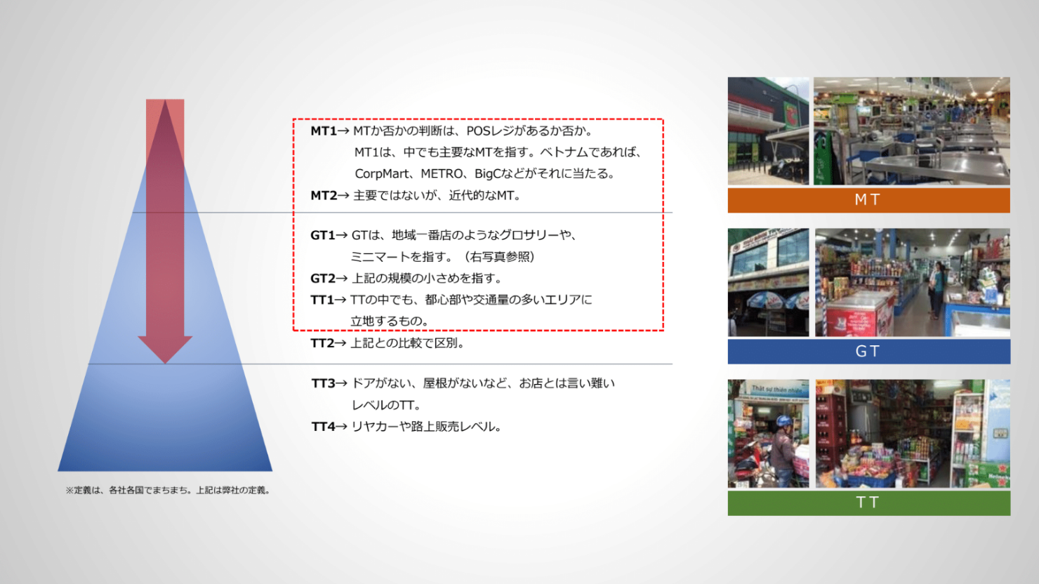 下記の図は、私が定義している8つの小売レイヤーです。まず、大前提として、近代小売(MT)に分類される小売は、POSレジの設置してある小売です。広く、近代的な店内だろうが、エアコンがかかっていようが、POSレジがなければ近代小売ではありません。その大前提をベースに、MT1とMT2に分けています。MT1は近代小売の中でも主要な小売です。例えばベトナムでいえばCO.OPmartやMETRO、BigC、VinMart、最近ではイオンも大きな存在感を放っています。フィリピンでは、SM、Puregold、Robinsons、Rustansなどがこれに当たります。POS レジがあり、近代化された店舗が MT2です。次に、一般小売(GT)も2種類に分けます。GT1は、POS レジはないまでも、店員が複数人いる「地域一番店」と言われるようなグロサリーやミニマート。自分たちが店舗でお客さんに売るだけではなく、商品を大量に仕入れて一般的な伝統小売に卸すという問屋の役割も担っている場合があります。この一般小売の中でも規模が小さめの店舗がGT2です。そして、伝統小売(TT)はTT1からTT4まで分けています。TT1は一般小売のように問屋機能は有してないものの、居住者が多いエリアにあったり、交通量や人通りが多いエリアにあったりする店舗を指します。TT2は、居住区内に立地し、地域住民のみが買い物に来る一般的な店舗です。そして、TT3はドアや屋根がなくてもかろうじて店を構えているようなところです。最後のTT4はリヤカーや路上販売といった違法まがいのレベルです。