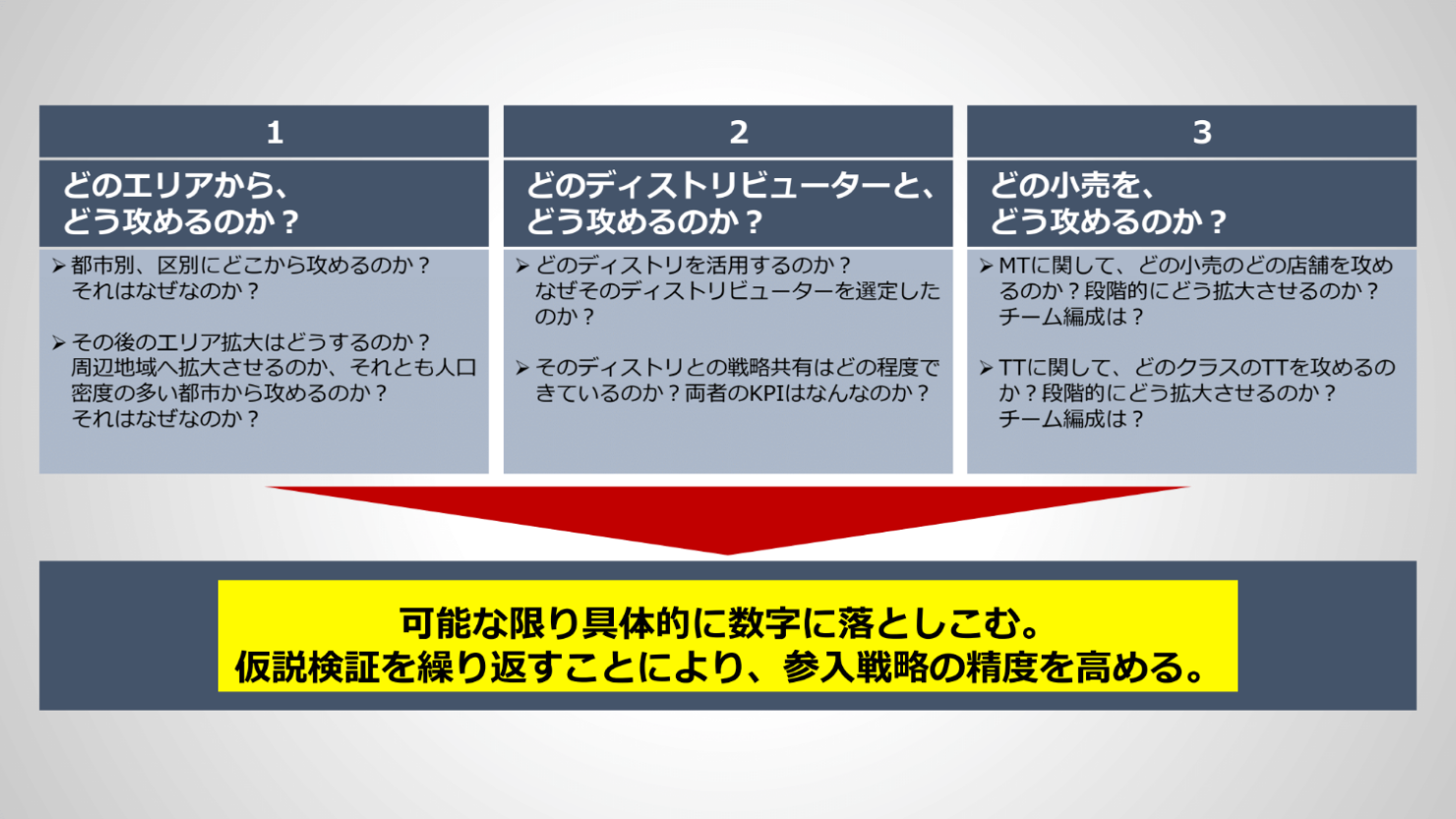 迷ったら、すべてのフレームワークを活用したらよいと思います。迷うということは、まだ概念が完全に整理できていないということなので、一度、すべてのフレームワークを活用しインプットすれば、概念の整理にもなり、戦略の精度もより向上すると思います。アジア新興国でストア・カバレッジとインストア・マーケットシェアを上げるためには、参入前に具体的なToDoを明確にしておかなければならないので、こうした様々なフレームワークは簡単に言えば、「どうやれば勝てるのか」ということを具体的に定性、定量で整理するためのツールなのです。