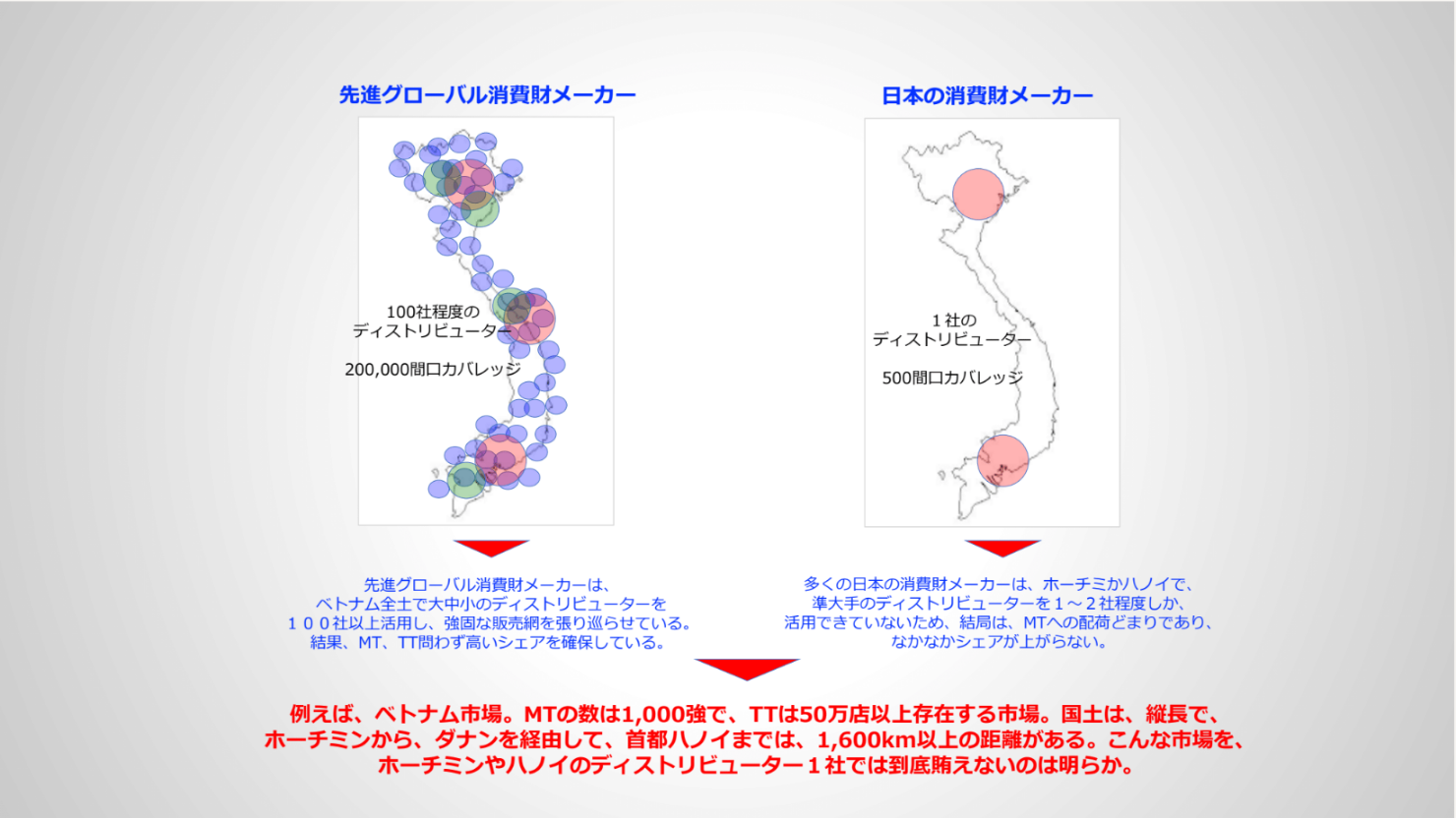 それでは、実際のベトナム市場での状況を見てみましょう。次の図は、欧米の先進グローバル消費財メーカーと、日本の消費財メーカーの例です。先にお話しした通り、ベトナムには、近代小売は約3,000店舗しかなく、一方で伝統小売が50万店存在します。そして、ベトナムの国土は縦長で、ハノイからダナンを経由して、ホーチミンまで1,600キロ以上あります。さらに、戦争の名残がまだあり、南部(ホーチミン)出身者が北 部(ハノイ)で活躍するのは、北部出身者が南部で活躍するよりはるかに大変な市場なのです。このような市場で、日系のある消費財メーカーは、ホーチミンに1社の中堅ディストリビューターを活用しているだけです。従って、ハノイでのシェアはほとんどなく、中部のダナンなどは完全に手が回っていません。対して、欧米の先進的なグローバル消費財メーカーは、大中小合わせて150社程度のディストリビューターを活用し、全国に強固なディストリビューション・ネットワークを張り巡らせているのです。当然ながら、結果として、日本の消費財メーカーとは、比較にならないストア・カバレッジを保有しているのです。