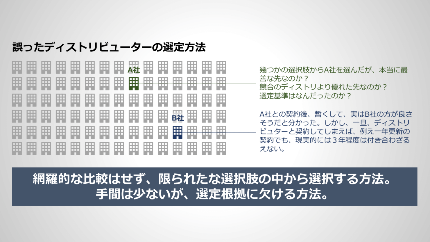 まず初めに申し上げたいのは、チャネル構築において、ディトリビューター選びは最も重要な仕事であることです。冷たい言い方かもしれませんが、ダメな相手といくらやっても、結果はダメです。