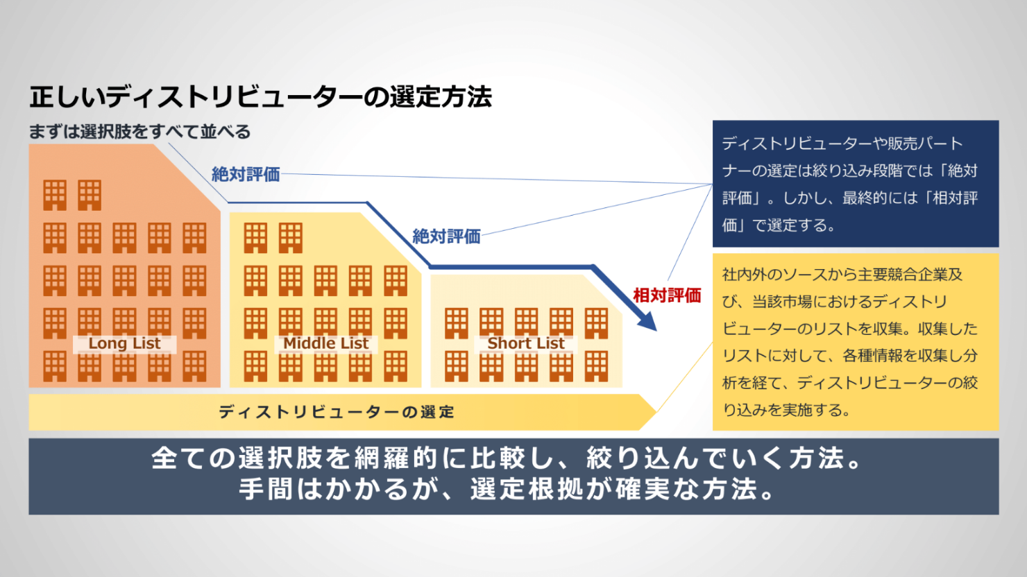 このロングリストでディストリビューターが100社収集されたとして、次にやるべきことは、「絶対評価」で自社の条件に合わない先を除外していく作業です。