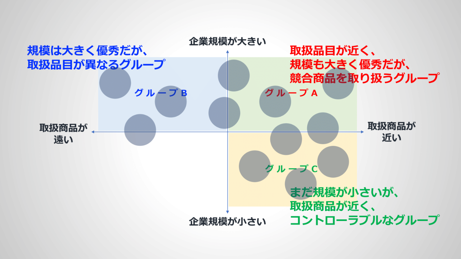 グループAは取扱商品が近く、規模も大きく最も優秀な会社です。グループBは取扱商品は違うものの、規模が大きい会社です。グループCは、まだ規模は小さいものの取扱商品が近い会社となります。左下は規模が小さくて取扱商品も遠いので、まずもって不適切となるわけです。