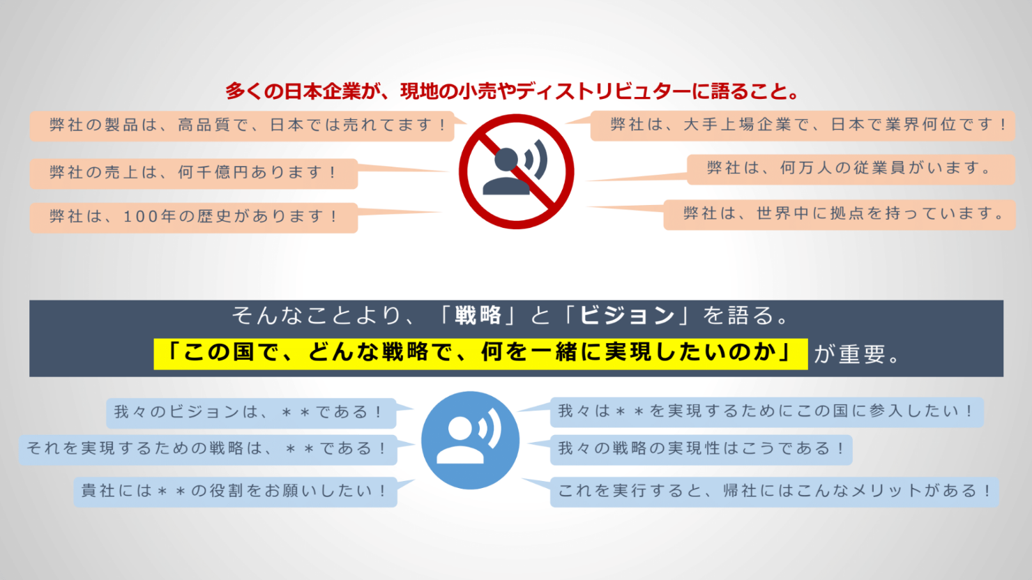 最も重要な、何のために異国であるその国に来て、何を実現したいのか。それはどのような方法で実現しようとしており、ディストリビューターには何を担ってほしいのか。そして、将来的にその国でどのような世界観を描こうとしており、双方にどのようなメリットがあるのか、つまりはビジョンと戦略を語りません。