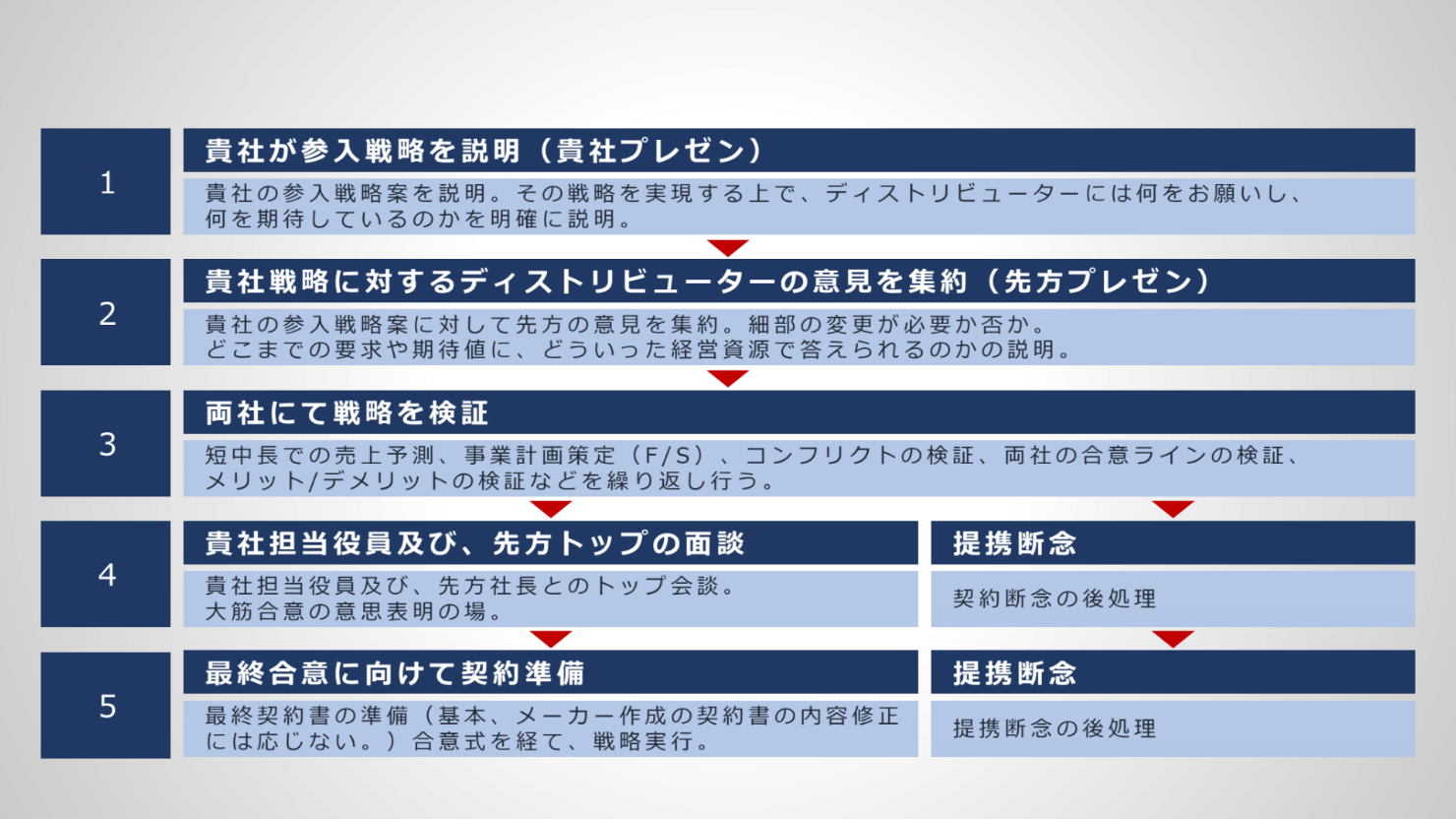 重要なのは、どのような目標をどのように達成するのか、その具体的戦略、KPI、プロセスを契約前にディストリビューターとしっかりと議論し、確定させ、それを含めて契約を締結することです。では、上図のプロセスを見ていきましょう。