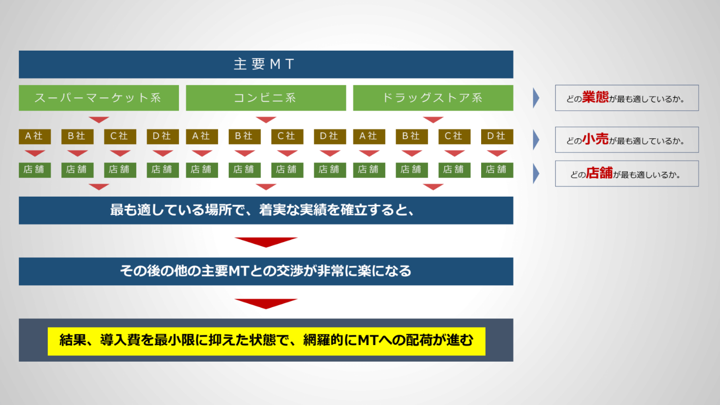 この近代小売チェーン店全店舗に拡大した後に、全体で商品が売れているとなれば、他の小売店との商談が非常に楽になるというメリットがあります。コンビニエンスストアA社で売れているものは、B社も、C社も取り扱いたがります。コンビニで売れているモノは、コンビニ的商品棚を置くドラッグストアも扱いたがります。ここでも交渉力は優位に働きます。そして、コンビニエンスストアやドラッグストアで売れているモノは、スーパーマーケットでも、入り数や梱包形態を変えて売りたがります。ここでも小売との交渉力が優位に働きます。各種導入費用を割安で、もしくは無料で取り扱ってくれる、エンドコーナーや特設棚に置いてくれるなど、様々なメリットを得られるケースも少なくありません。 某菓子メーカーは、この方法で最小のコストで最大の効果を出しています。