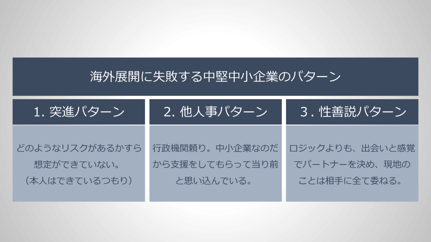 では、早速本題に入りたいと思います。まず、中堅中小企業が海外事業を行う際は、マインドセットを改めなければなりません。これは中堅中小企業のタイプ(性格)によっていくつかのパターンがあるのですが、うまくいかない企業の代表的なパターンをいくつか紹介します。まず1つ目は、「突進パターン」です。これは、あまりにも海外のことに関して無知で、どのようなリスクがそこにあるのかまったく想定ができておらず(当人は想定できていると思い込んでいる場合が多い)、もちろん戦略も持たずに、日本国内でそれなりにやってきた自負で海外も同じようにやろうとするパターンです。ひたすら突進し、赤字幅がある程度まで行くと撤退するという、一気に 出て、一気に撤退するパターンです。中小企業になればなるほど会社の性格=社長の性格なので、このような社長が旗を振って進める海外展開は非常に危険です。もちろん、突進力は海外事業を行う上では大変重要で、その突進力に戦略性が備わっていると強いのですが、そのようなケースはかなり稀です。